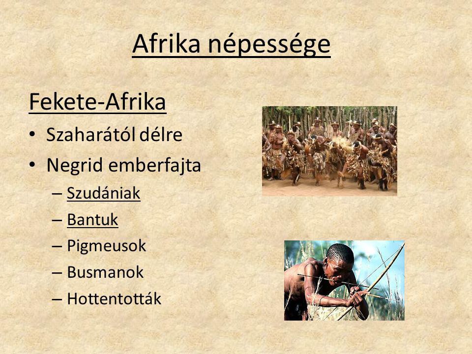 Afrikában a területéhez képest kevés ember él. A lakosság csaknem fele 15 éven aluli. Az átlagos népsűrűség alacsony, de vidékenként nagy eltérést mutat. A legsűrűbben lakott tája a Nílus völgye Egyiptomban (400 fő/km²). A tengerparti nagyvárosokban szintén sok ember él. Ugyanakkor a sivatagok, esőerdők, magashegységek szinte lakatlanok.Afrika nagy részének az őslakói a fekete bőrűek. Jellemző külső tulajdonságaik: előreugró állcsont, széles, lapos orr, duzzadt ajak, széles váll, sötét bőr, sötét, göndör haj. Egyik fő csoportjuk, a szudániak az egyenlítőtől északra, míg a másik, a bantuk e sávtól délre élnek. Az Észak-Afrikában élő arabok a fehér bőrű embercsoport tagjai. Kisebb népcsoportokat képeznek az apró termetű, őserdei élethez alkalmazkodott vadászó-gyűjtögető pigmeusok és Kalahári-vidékén élő busmanok. A kontinens mediterrán éghajlatú tájaira európai bevándorlók telepedtek le. Ők kapcsolták be a kontinenst a világgazdaságba. A legtöbb fekete-afrikai országban ma is az egykori gyarmatosítók nyelve a hivatalos nyelv.